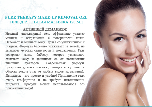 PURE THERAPY MAKE UP REMOVER GEL — це дуже ніжний засіб для зняття макіяжу у формі міцелярного гелю, дуже легко знімає навіть водостійкий макіяж. Чудова олія бабасу в складі гелю допомагає зволожити суху шкіру. Також цей компонент допомагає розгладжувати зморшки навколо очей.