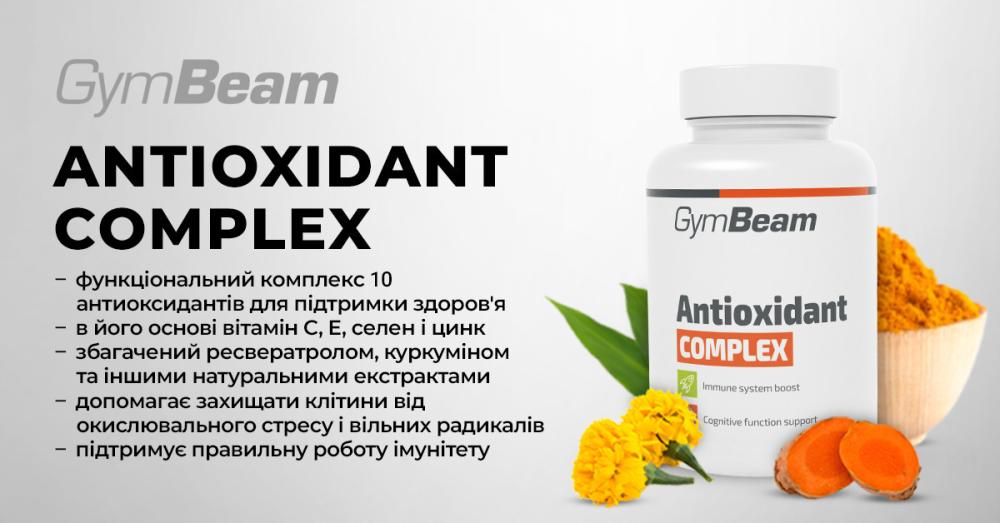 Антиоксиданстний комплекс - ретельно підібрана комбінація вітамінів, мінералів і рослинних екстрактів, які сприятливо впливають на здоров'я і життєву силу. Основу цієї дієтичної добавки становлять добре відомі антиоксиданти у вигляді вітаміну С, Е, цинку і селену, які сприяють захисту клітин від окисного стресу. Їх доповнюють такі природні антиоксиданти, як ресвератрол, кверцетин, куркумін, лютеїн і зеаксантин що ще більше посилюють дію всього комплексу.