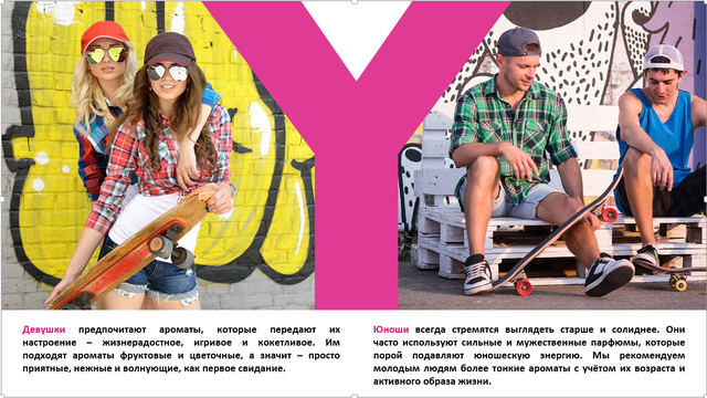 Цей аромат створений для молодої кокетливою дівчата – романтичний і ніжний, як її посмішка. Верхня нота звучить інтенсивним фруктовим поєднанням стиглих цитрусів. В "Серце" парфумів домінують квіти жасмину і троянди. Базою цієї ніжної композиції є обволікаючий мускус і тонкі ноти сандалового дерева та амбри. Вже не дитина, але ще не жінка, вона юна, нестримна і влюблива. Y – розкриє всю красу і трепетну ніжність її прекрасного віку!